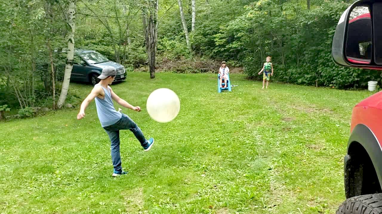 A young girl falls off a slide in the backyard when a teen boy kicks an exercise ball and it hits her in the face.