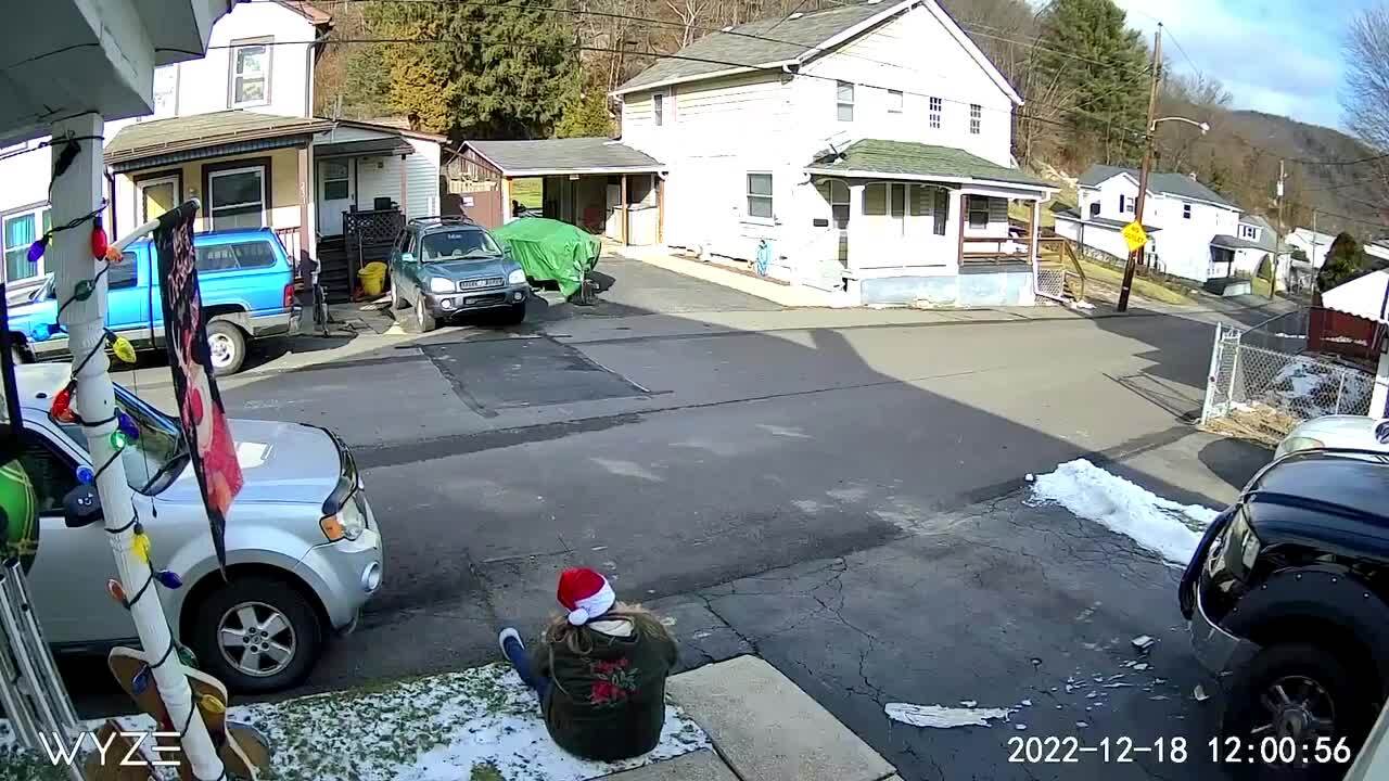 A woman attempts to deliver fresh breakfast to her neighbors on Christmas but trips in a driveway and falls while she spills the food all over. Security footage.