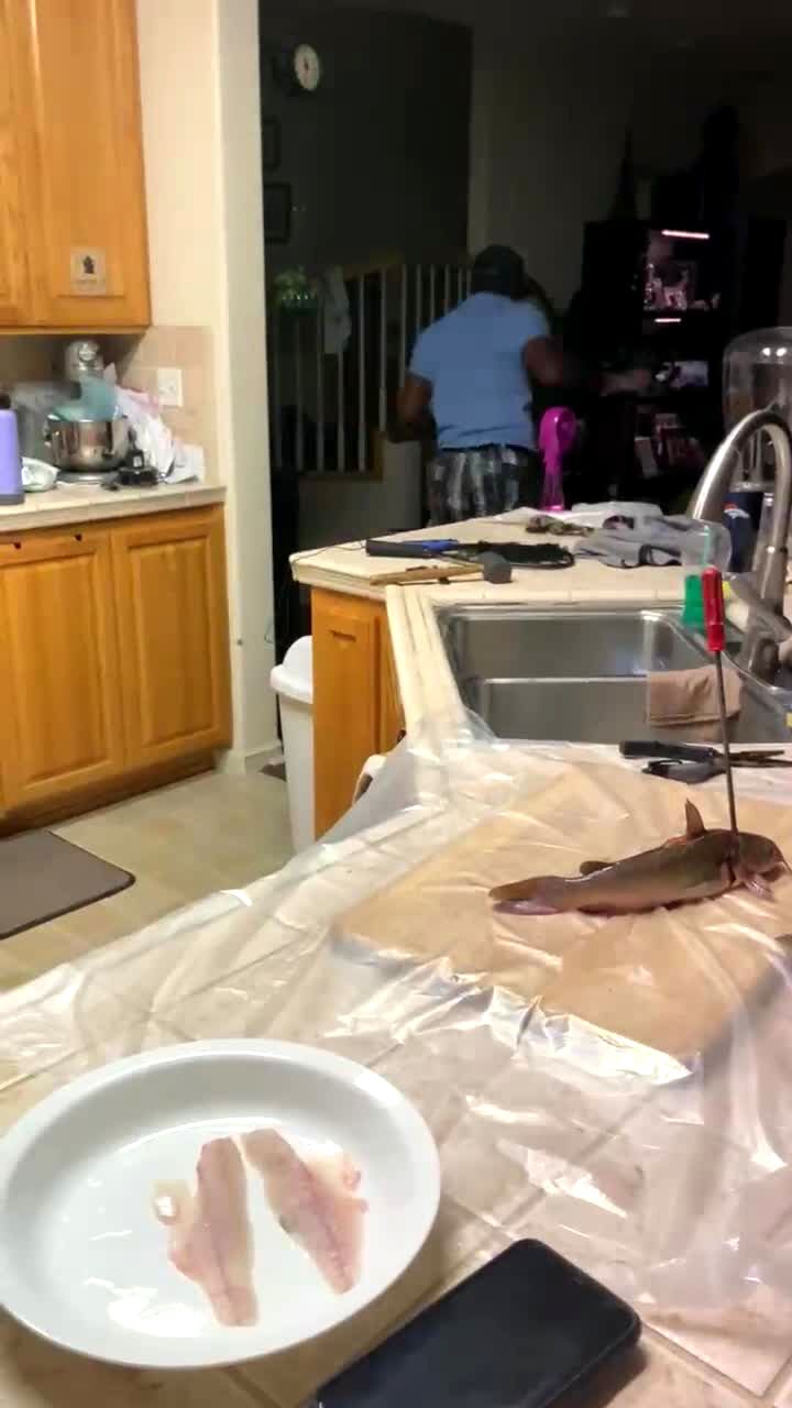A man cuts into a fish before its tail flaps which sends him into a tizzy as he runs out of the kitchen and gasps.