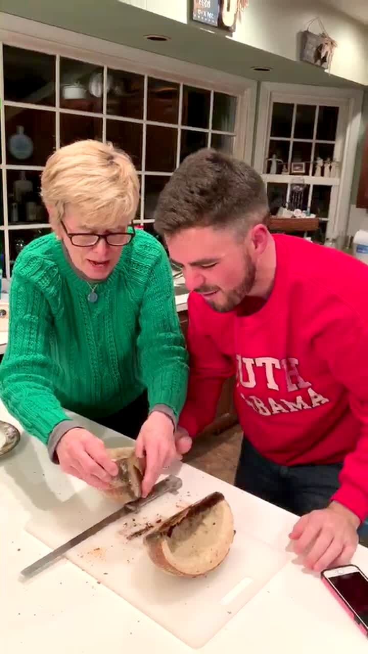 A man cuts open a loaf of his first homemade sourdough bread in the kitchen. When he cuts it open, the inside of the bread is hollow and everyone screams.