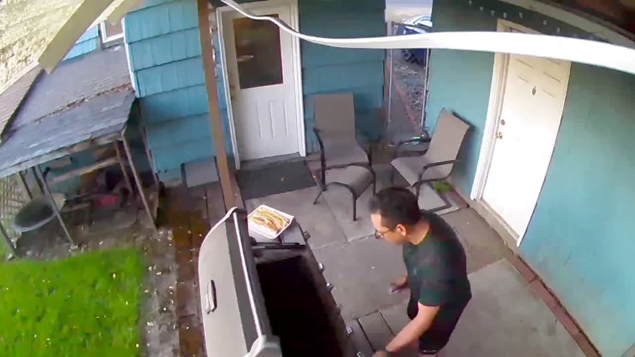 A man lights a grill and it the flame briefly bursts in his face. Security footage.