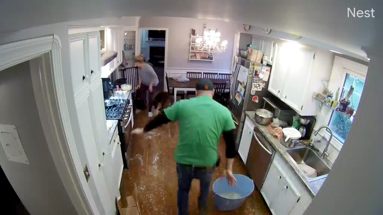 A man tries to open a brine bag for a turkey, and the bag breaks then spills all over the kitchen floor. A woman sees the mess and says "I don't even know what to do right now." Security footage.