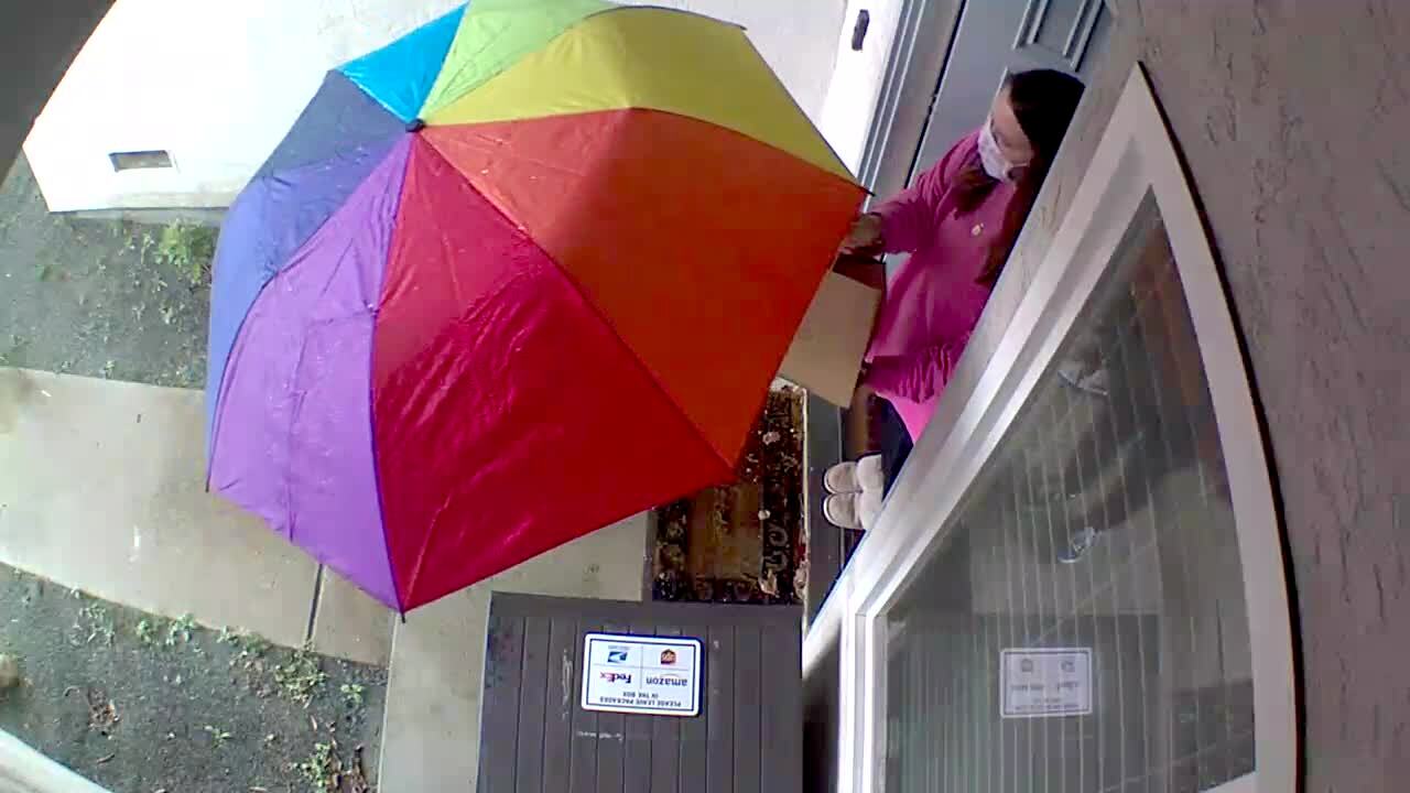 A woman with a rainbow umbrella carries a bag with Tupperware full of food on a porch and hands it to another lady in a doorway and the bag tears and falls on the floor and the food spills. Security footage.