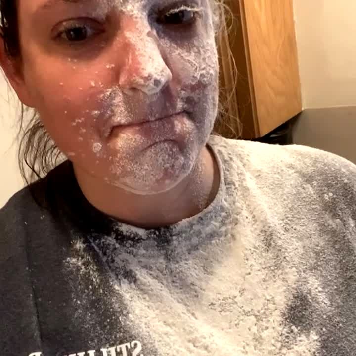 A woman in the kitchen drops her flour container and it gets all over the kitchen and herself.