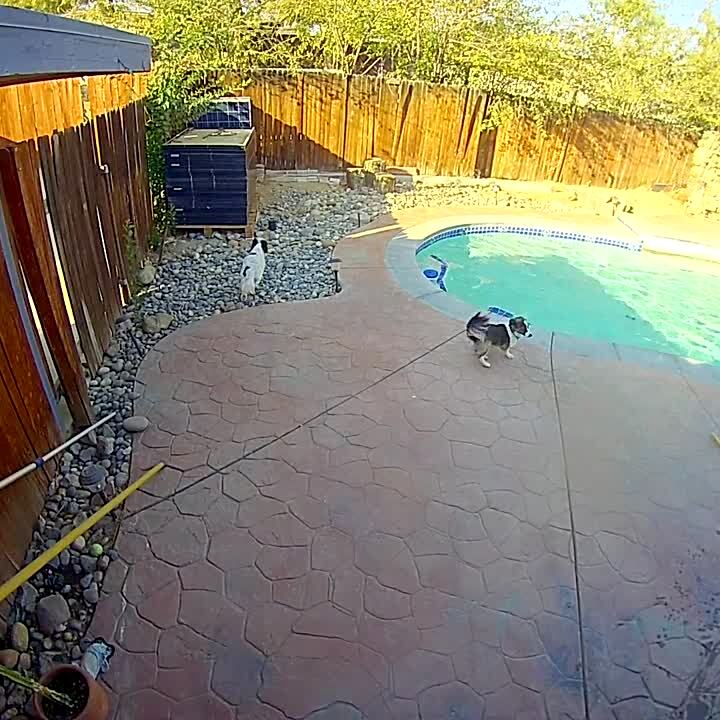 A man carries a door through the backyard and steps into the pool and falls in the water and the door hits him on the head. Security footage.