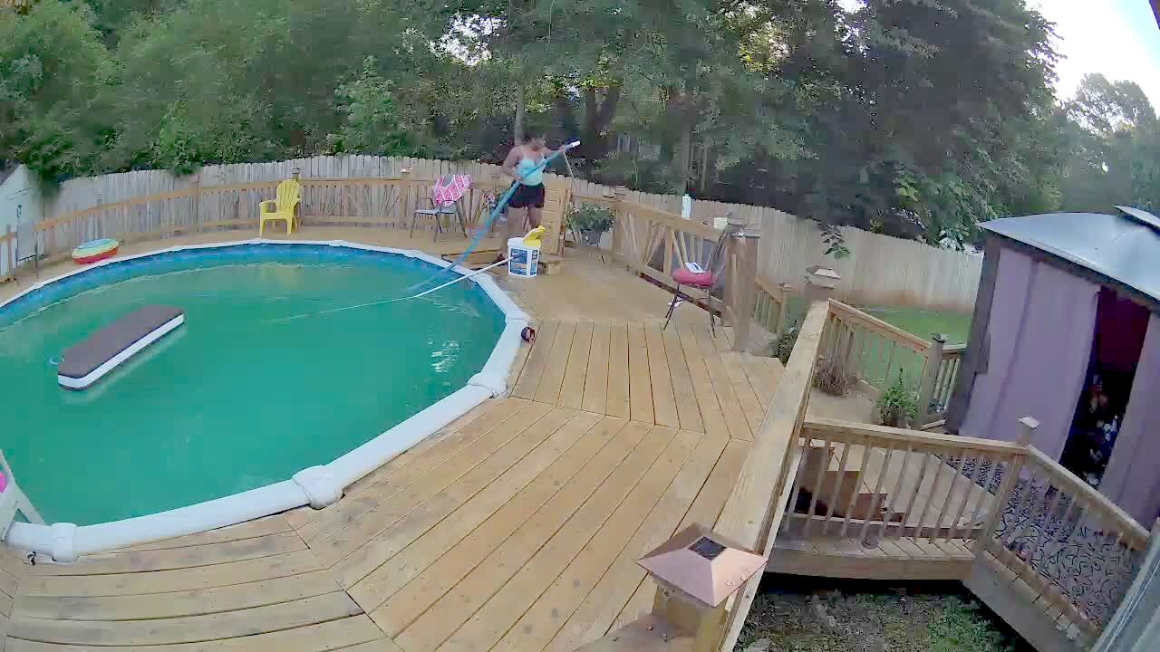 A woman cleans her in-ground swimming pool in her backyard. She falls through a trapdoor in the deck. Security footage.
