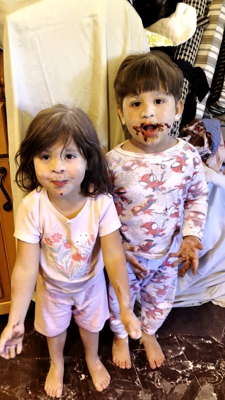 A young brother and sister have flour and chocolate syrup all over themselves and the kitchen floor. The boy runs back and forth and says "it's delicious and nutritious!" and smiles at the camera.
