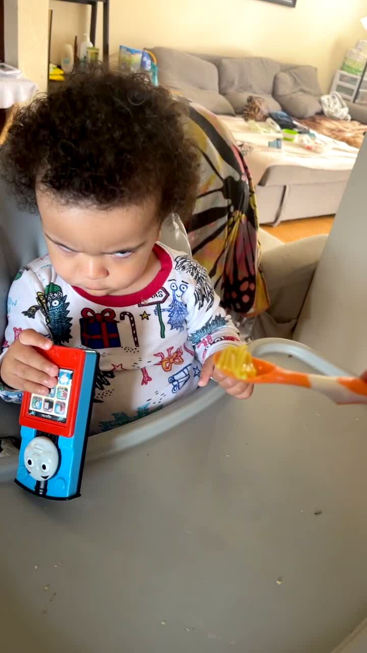 "Eye-Rolling Rascal" A baby boy tries to take his spoon from his mom, but she says no. He glares at her, and she tells him she can say no. Then he rolls his eyes at her.
