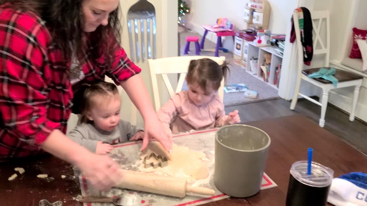 A mother films cookie dough pieces on a baking sheet in the kitchen and says "there's supposed to be twelve," then she turns the camera to show that her baby girl daughter holds a piece of cookie dough and sucks on it.
