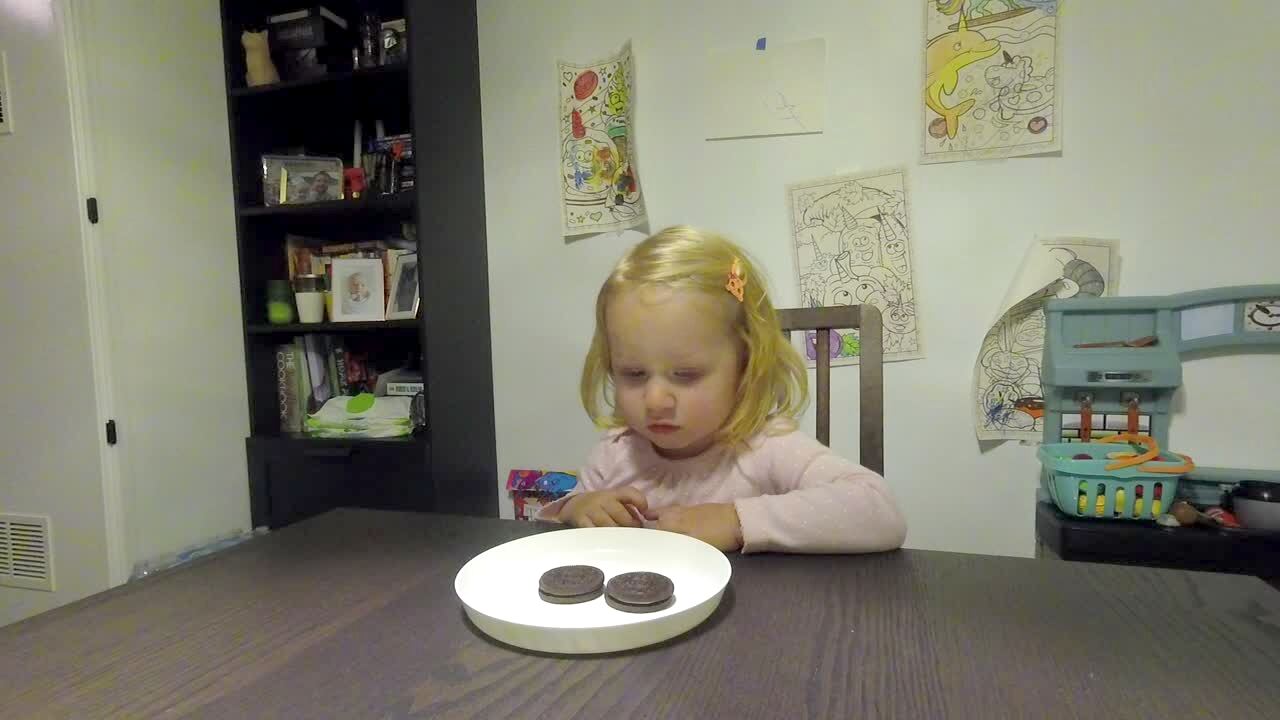 A woman puts cookies in front of a tot girl and tells her not to eat them until she comes back. The tot girl smells the cookies, then she picks them up and licks them.