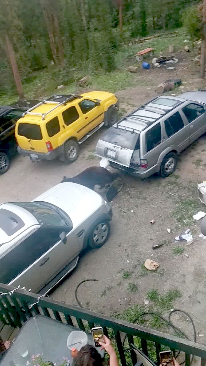 Two people try to free a black bear from their car. After several attempts, and one of them falling down, they're finally successful in opening the liftgate, allowing the bear to escape and run off into the woods.