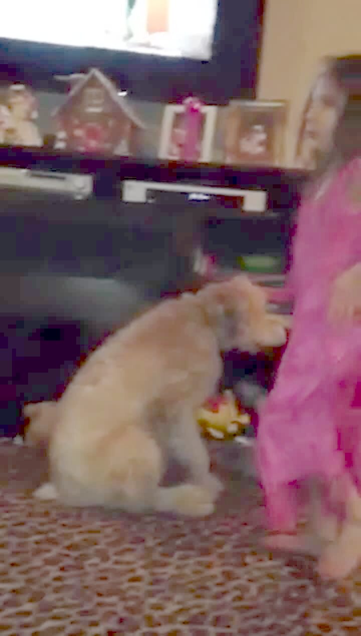 Tot girl runs into living room, turns on stereo to oldies tune, dances and shakes butt in time to music.