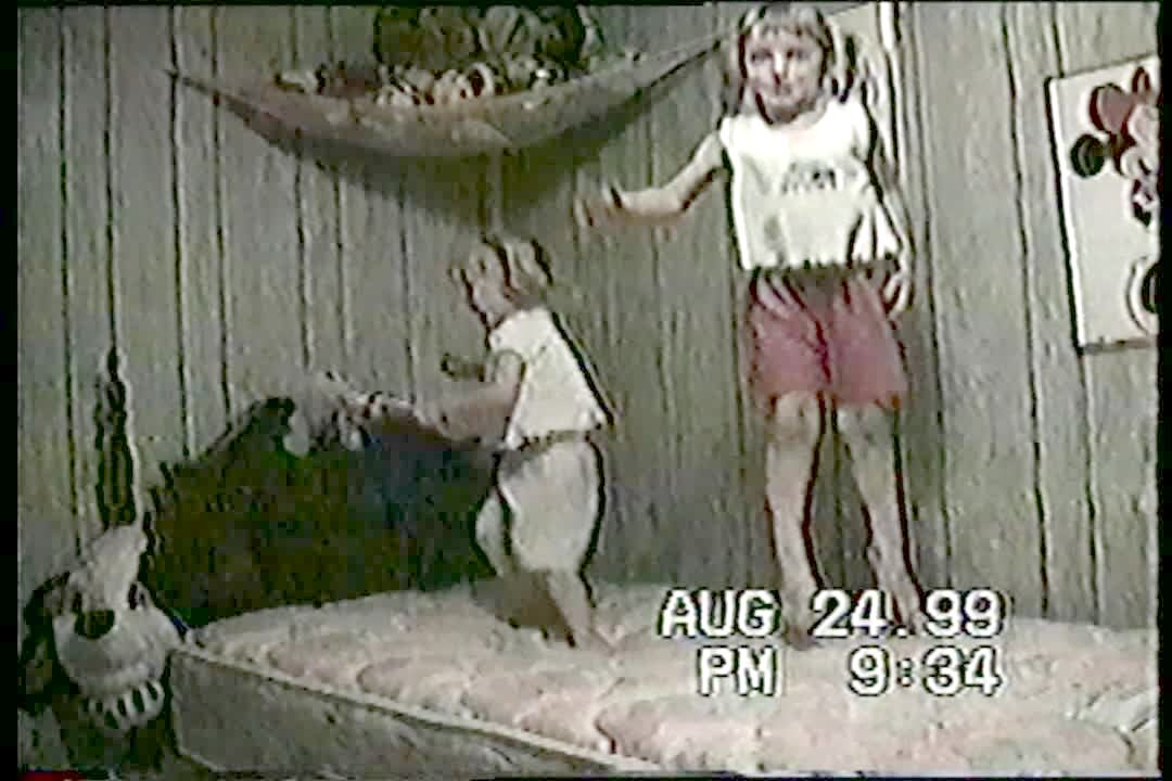 A young girl dances indoors. Her father enters the room and dances behind her until he falls down.