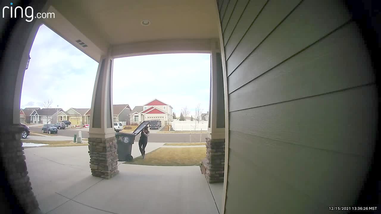 A woman tries to drag a trash can into her garage, but the wind flips the lid up in her face. Security footage.