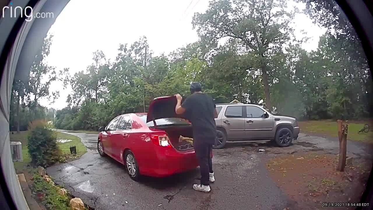 A young woman runs from the passenger side to the driver side of a parked car on a driveway while a man opens the trunk to get something, then the young woman drives away with the trunk open, and the young man runs after the car. Security footage.