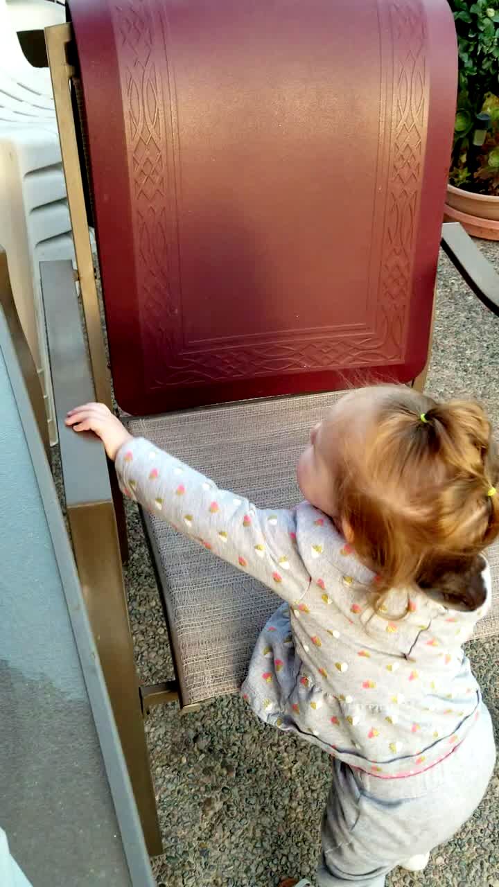 A young girl tries to pull a refrigerator door open. She pulls for a while and says she can not open it. A man tells her to try the other side. The girl tries the other side and it opens.