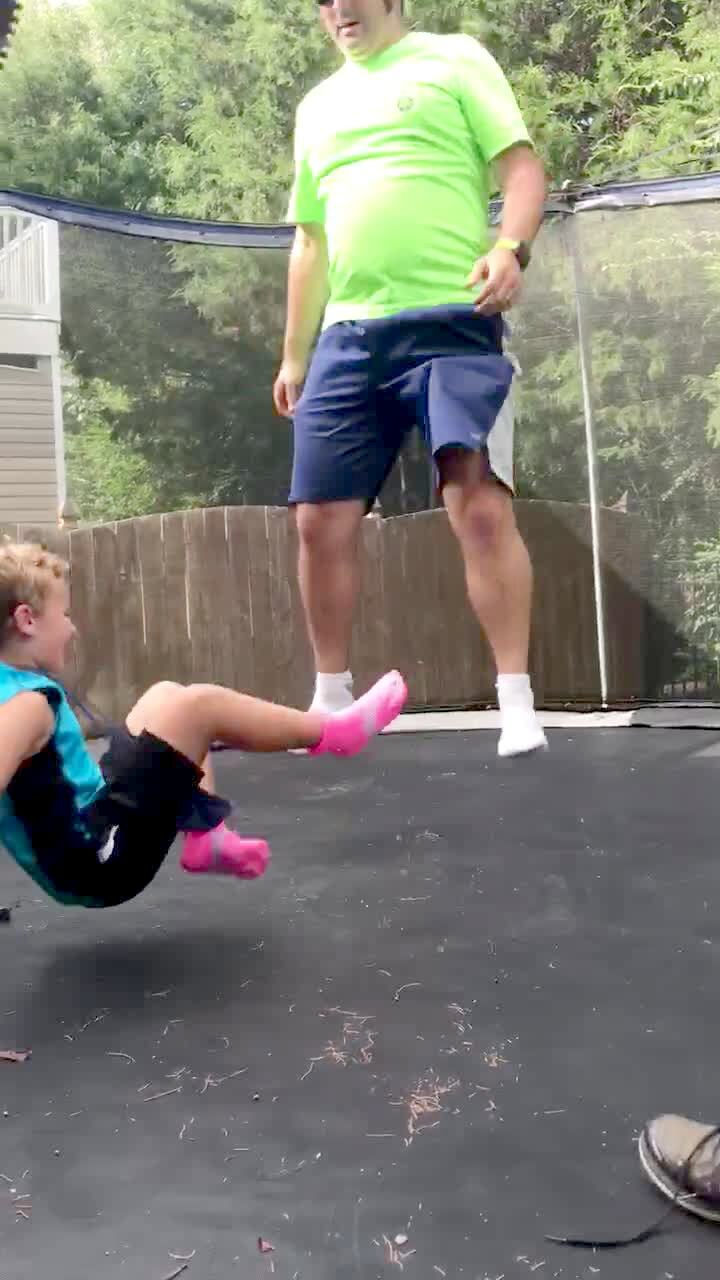 A dad tries to cook an onion volcano and it catches on fire on a hibachi grill in a kitchen and a young girl and young boy look scared.