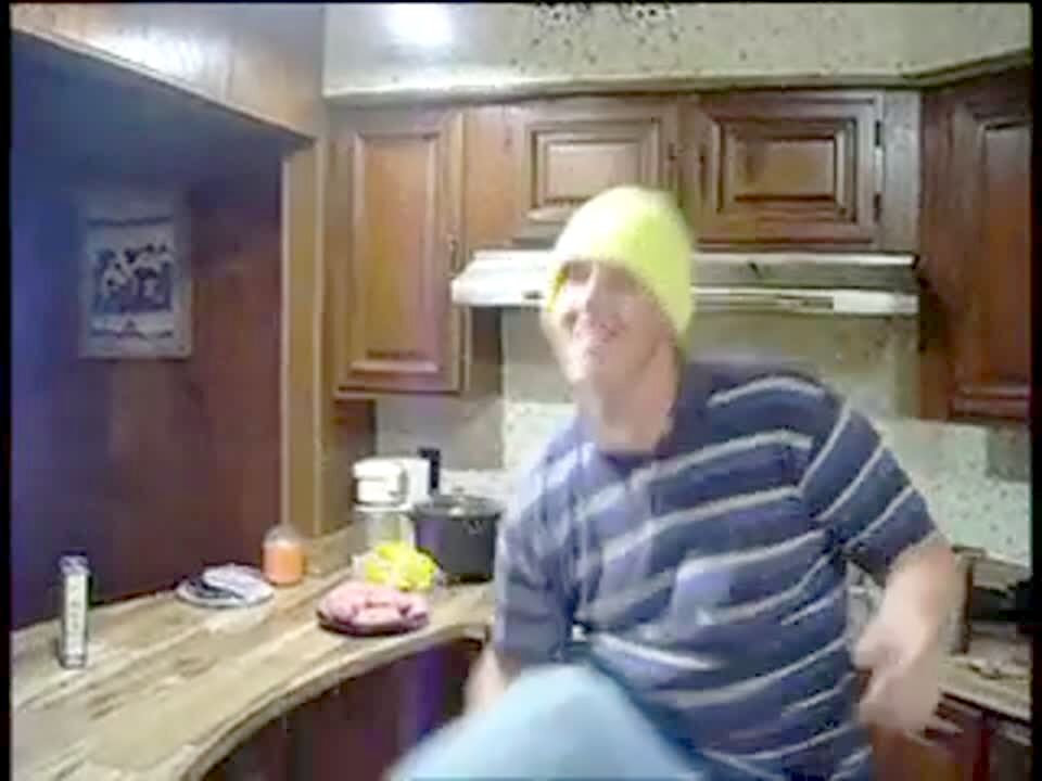 Teen boy in yellow ski hat makes a hamburger & throws it up to the ceiling, it sticks there.