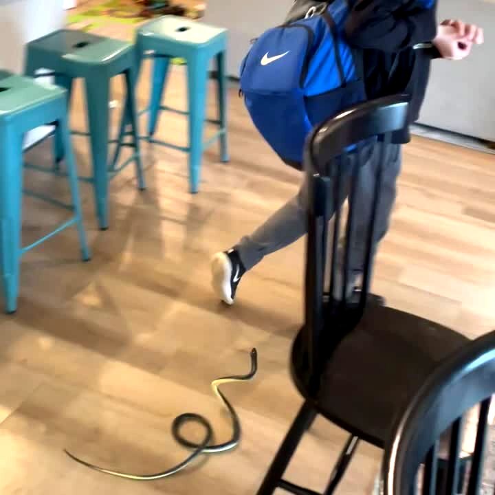 An off-camera father calls his young son out to the garage and tells him to hustle and the boy runs into a piece of tape stretched across the door and it wraps around his head.