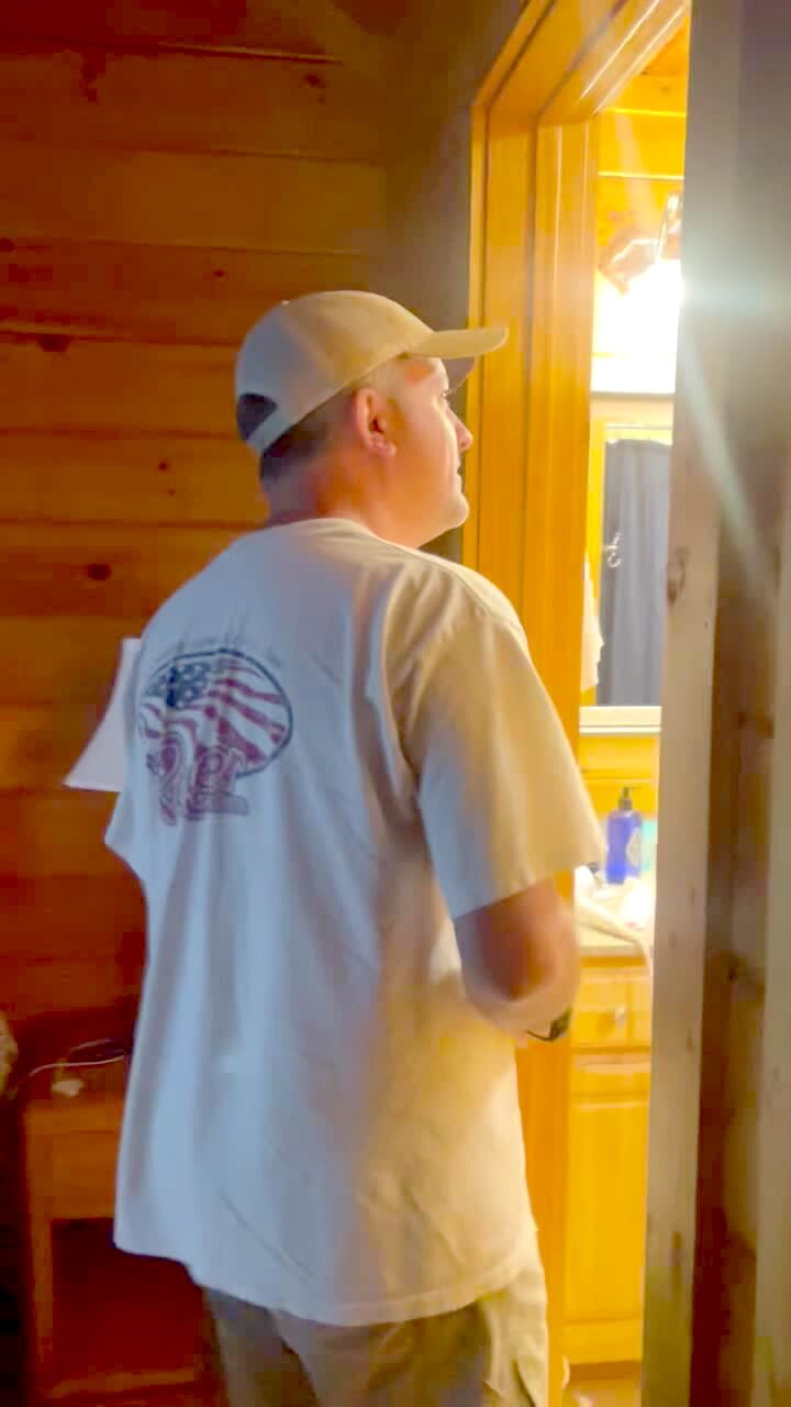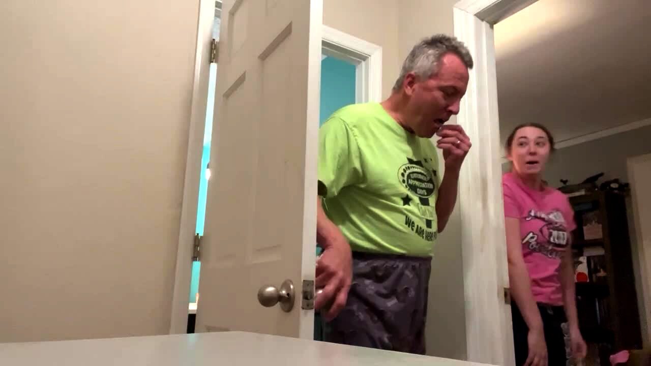 A man plays a practical joke on his wife, telling her that there's a bat is in the bathroom while she takes a shower. He throws a sock behind the shower curtain, and she screams.