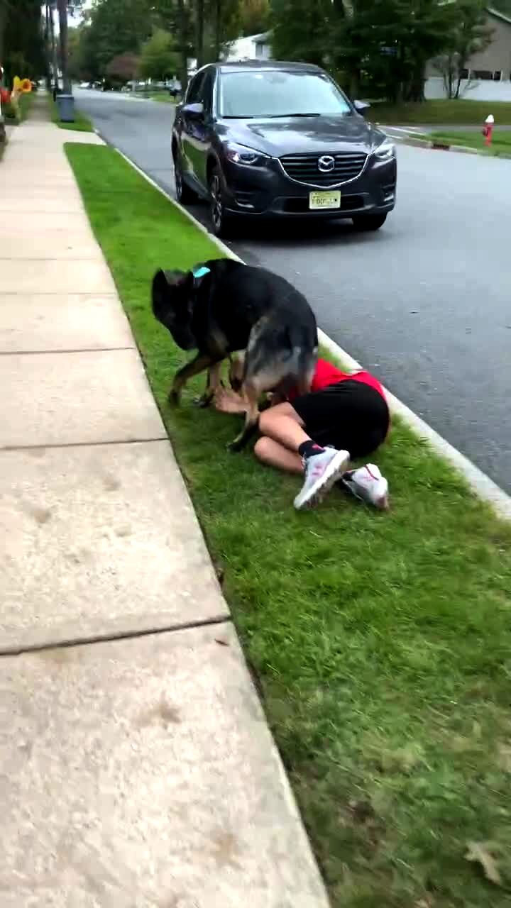 A teen girl walks a German shepherd dog past Halloween decorations in a yard, then the dog jumps away and knocks her over.
