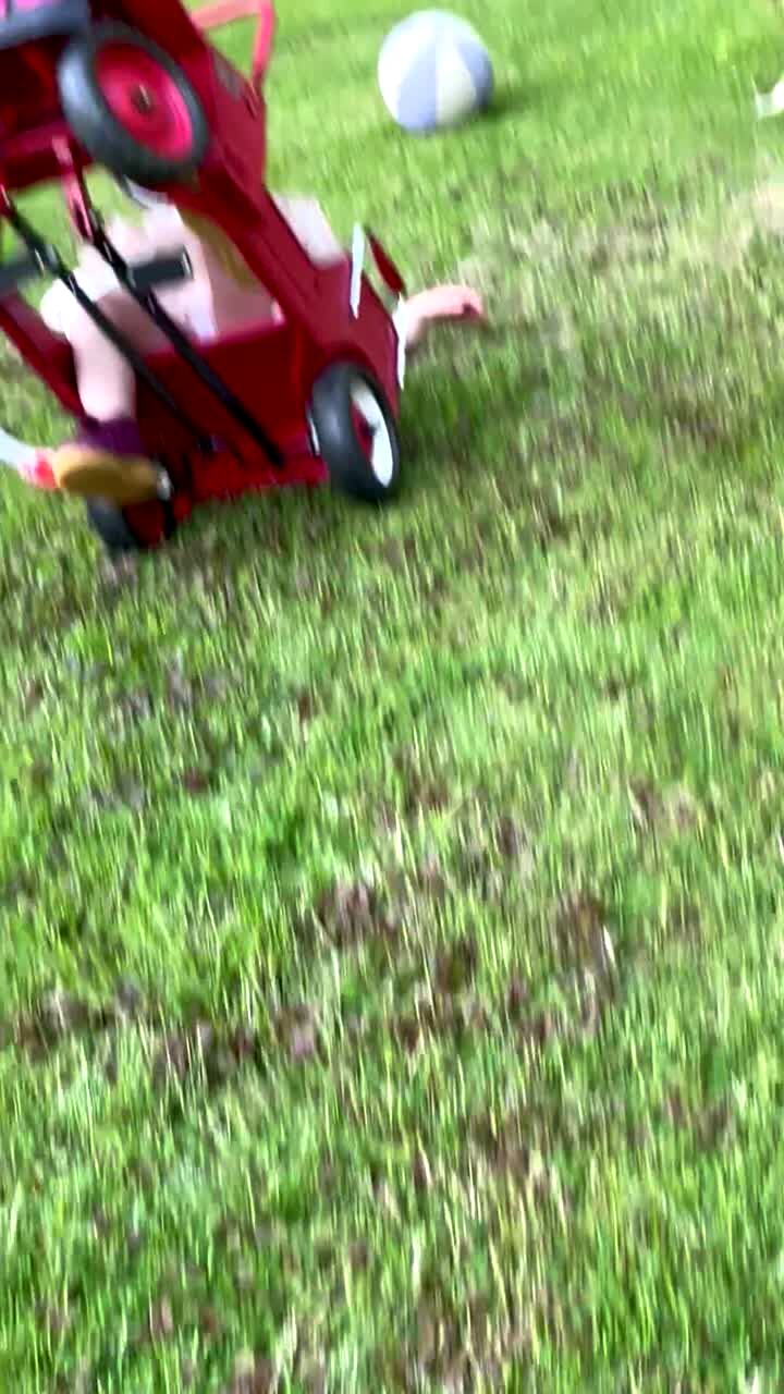 A yellow Labrador retriever dog jumps on a young girl's toy car and knocks her over in a yard.