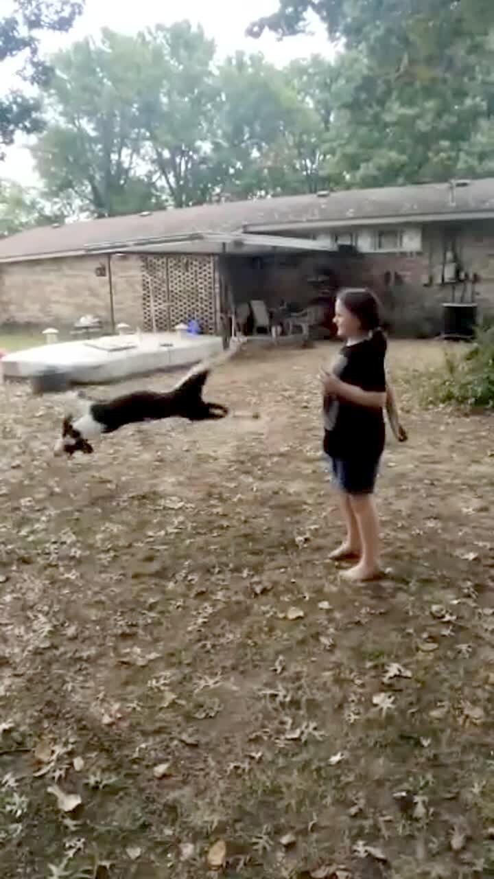 A young girl pretends to throw a dog toy in the backyard, and a dog does a backflip each time. Then she throws the toy, and the dog runs and brings it back.