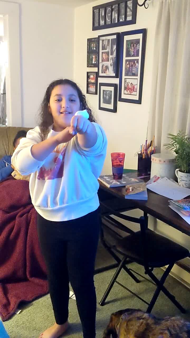 A teen girl hides around the corner and a man walks out of the bathroom and looks down at a dog and she jumps out and says "pow!" and he jumps and shouts "don't do that" and almost falls.