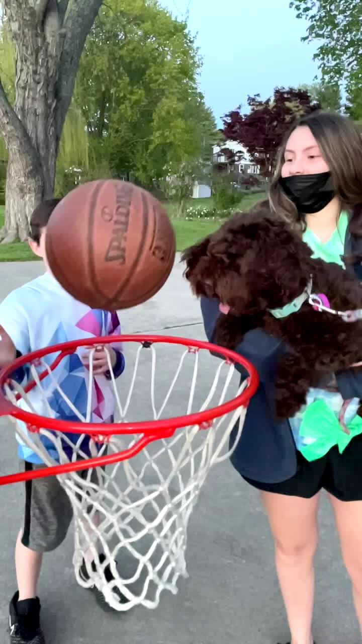 A young boy throws a basketball to a dog that a teen girl holds next to a basketball hoop in the yard, and the dog hits the ball with his mouth, but it bounces back to him, so he hits the ball again, and then it hits the young boy in the face. Slow Motion