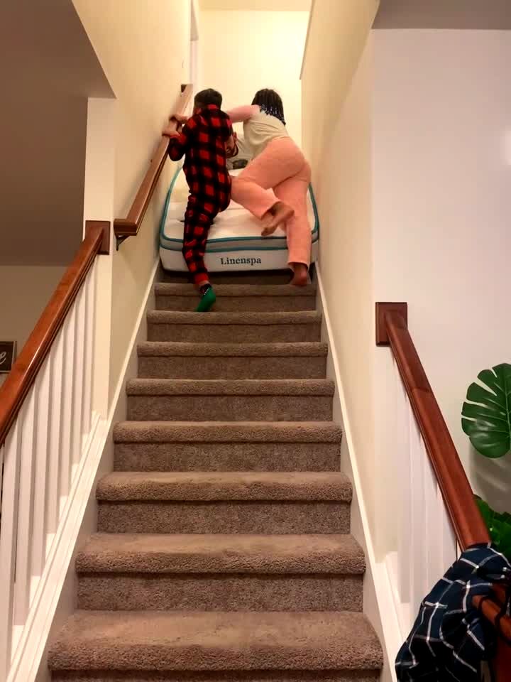 A man, young boy, young girl, and dog sled down a flight of stairs on a mattress at home, then the young boy hits the ground and cries.