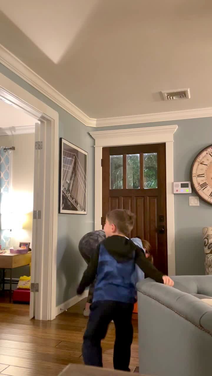 A young girl and her mother do the computer mouse in the house prank on her father and he throws it out the front door and laughs in the living-room.