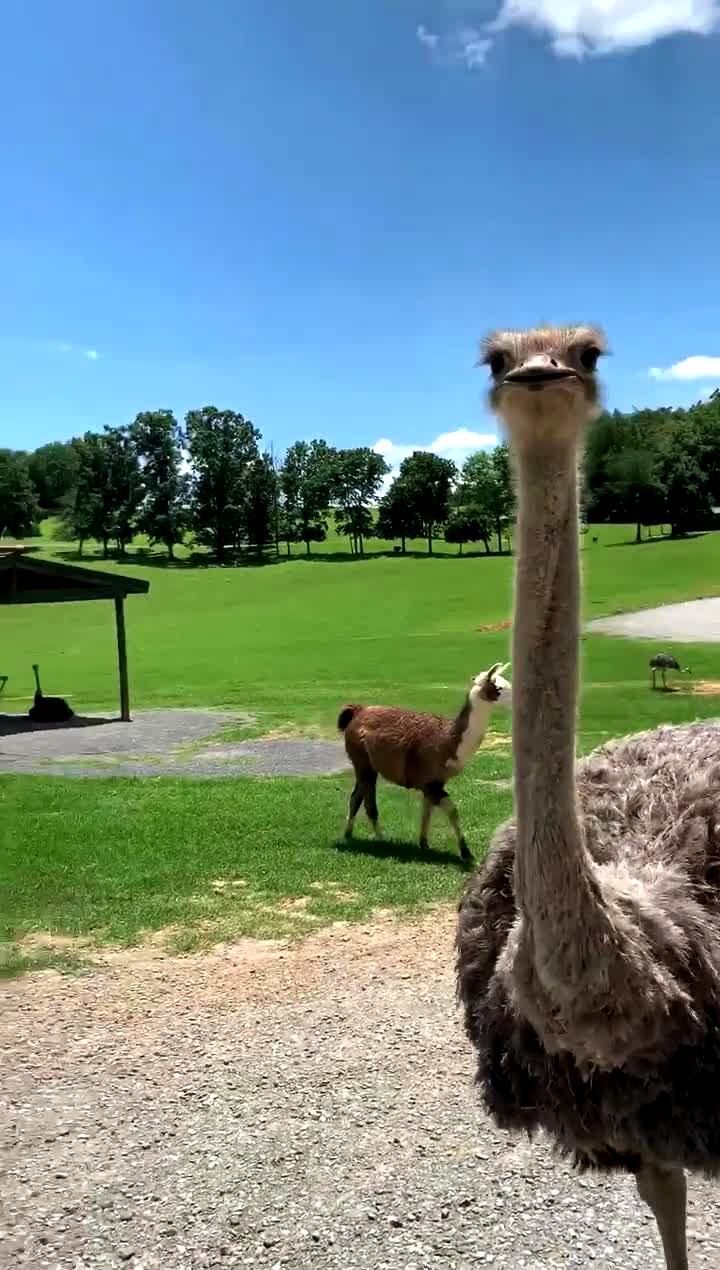 An ostrich sticks its head into a car window at a drive through safari. The man filming yells when the large bird bites him and says "son of a bitch ate my finger."