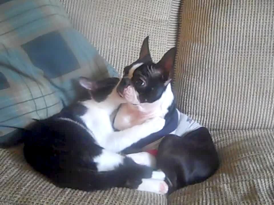 While he sits on a couch, a young boy hugs and licks the cat. He says "that's just how I say I love her." He then wipes his mouth.