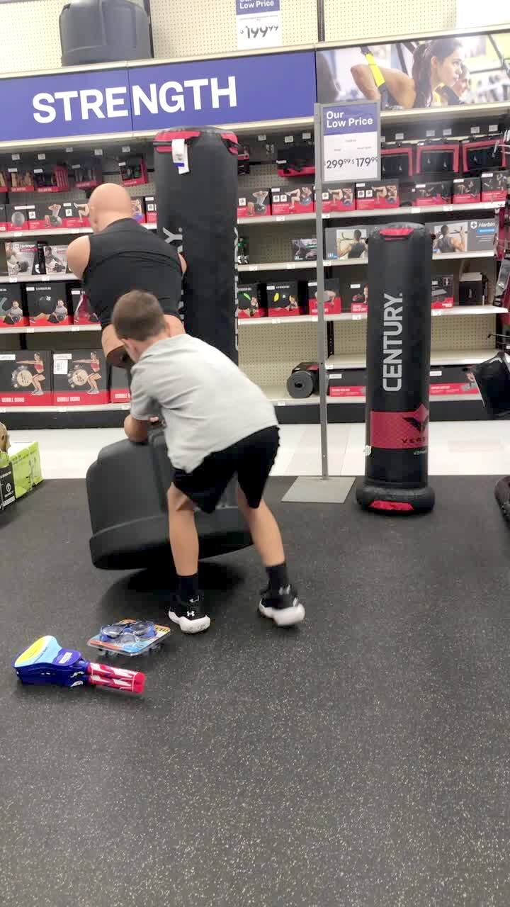 A young boy punches and kicks a dummy in a sporting goods store and he tries to kick the head and slips and falls.