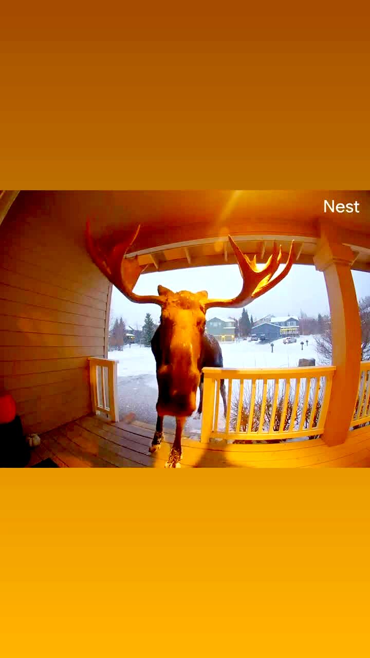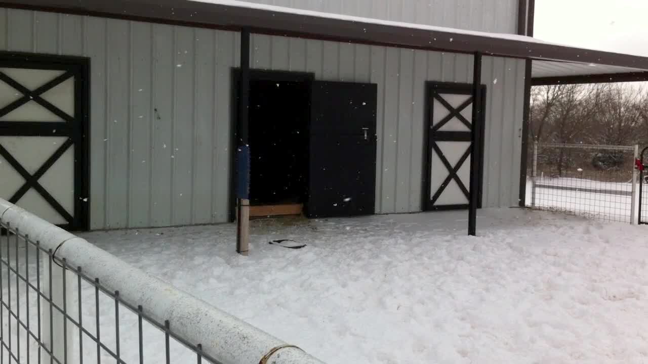 A teen girl walks out onto a patio deck to walk her dog when she slips and crashes down onto the icy stairs. Security footage.