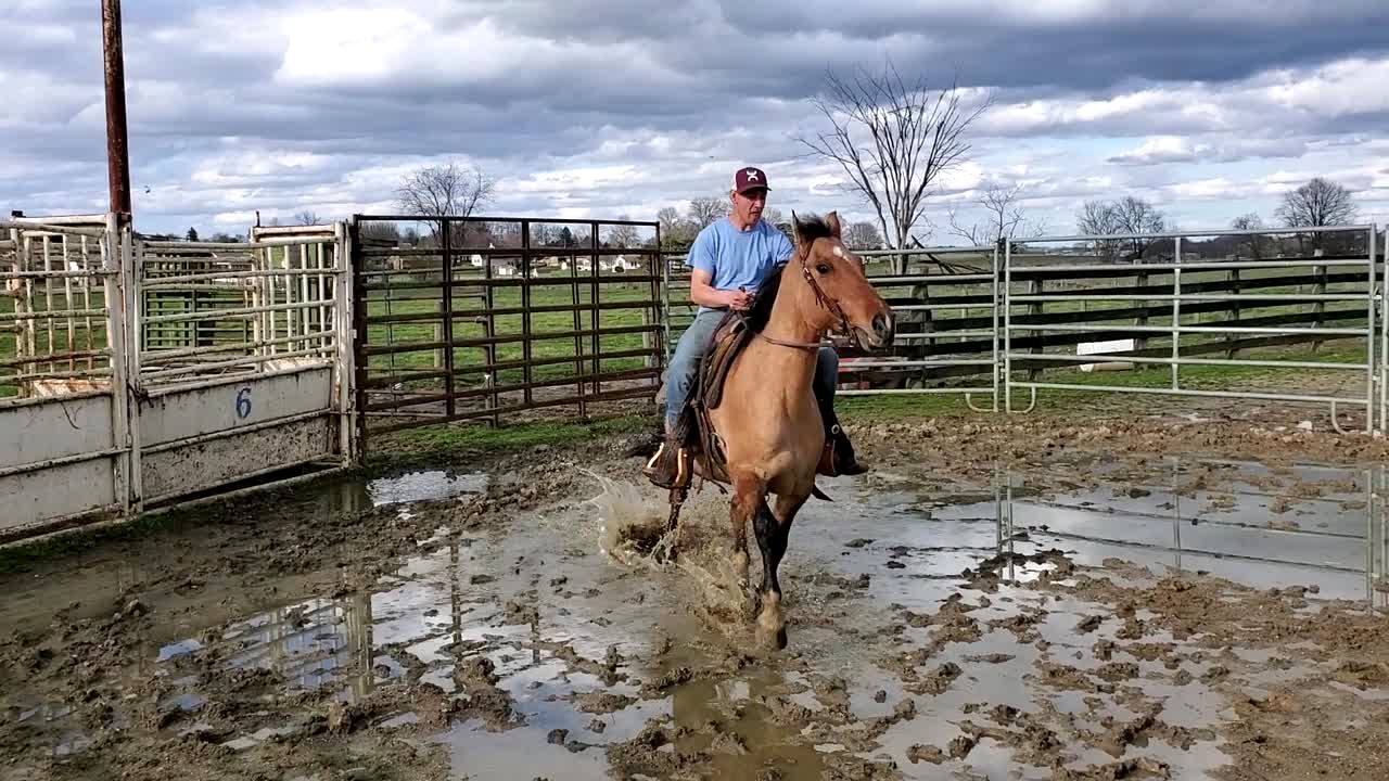 A horse bucks a man off his back and throws him into a mud puddle in a paddock.