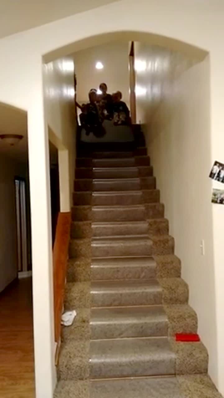 A group of young kids sit on a mattress at the top of the stairs and a boy falls off the front before they can ride down. He lands on the steps and the mattress comes down the stairs and runs him over and pushes him down the stairs.