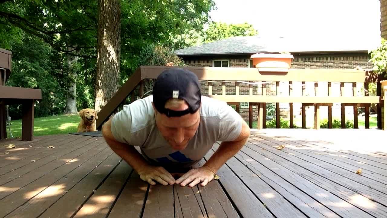 A man does push ups on a porch and his dog licks his face and walks under the man's chest.