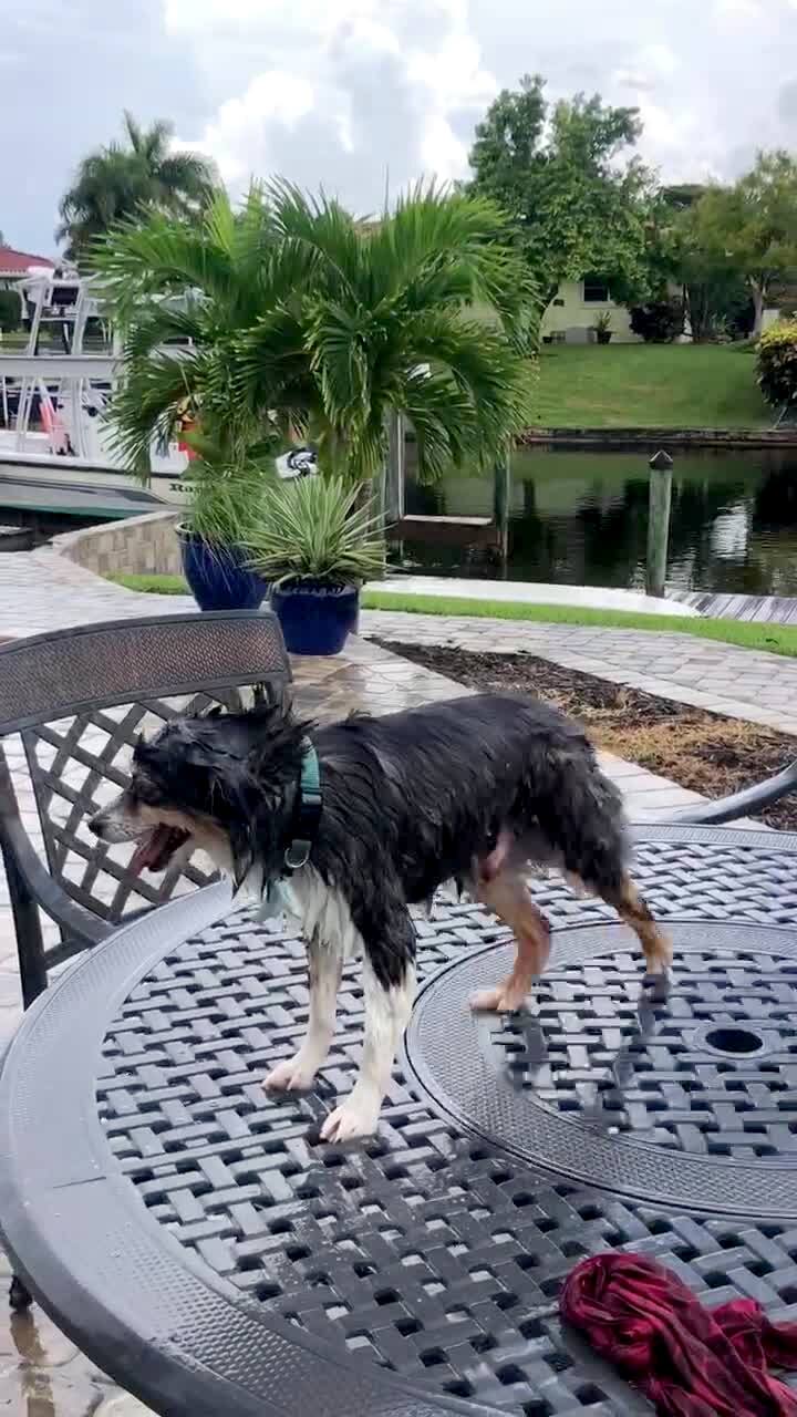 A dog stands on a table in a yard and uses its back legs to run on the spot as it spins around a Lazy Susan.