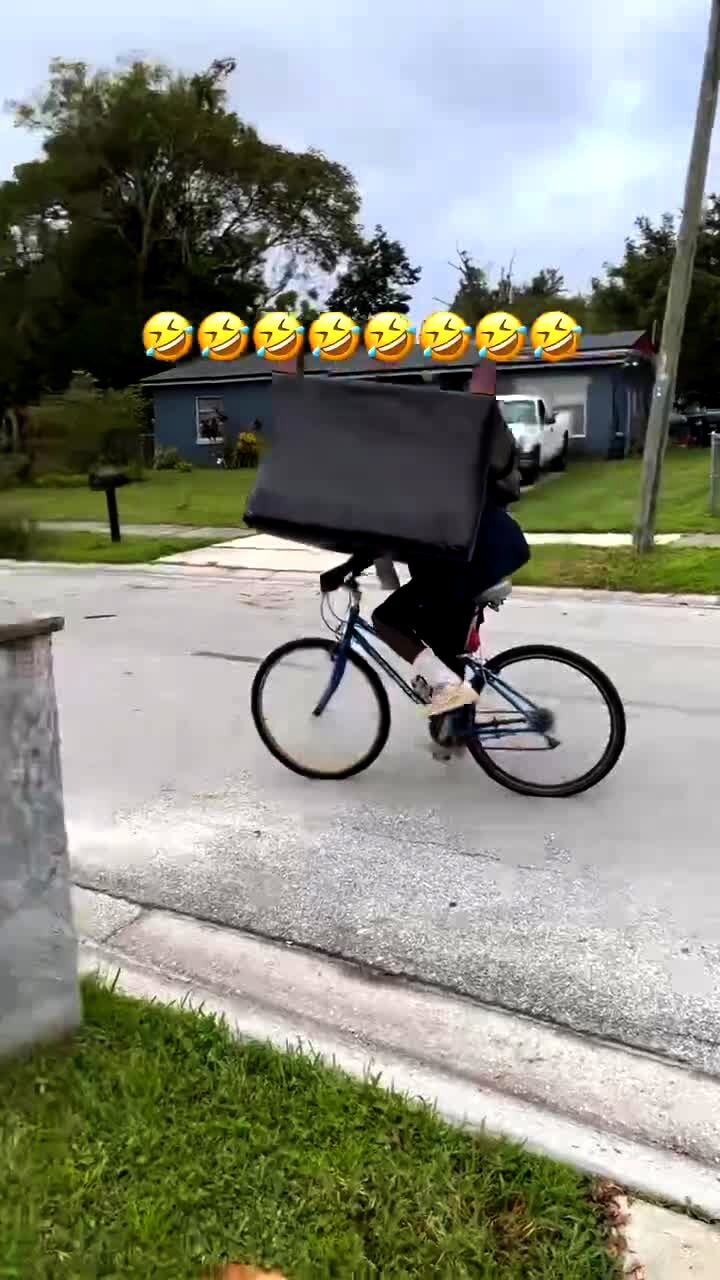 A young boy runs over himself with a giant remote-controlled car while in a living room.