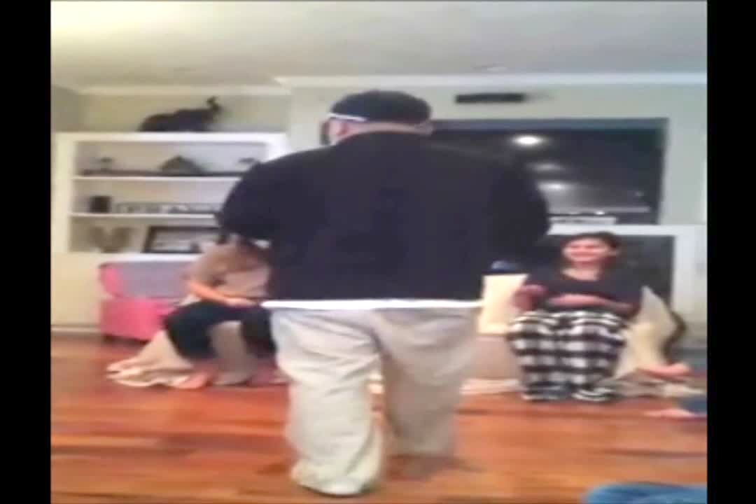 A man falls in the kitchen while he dances to a rap song as he rides a hoverboard while drunk.