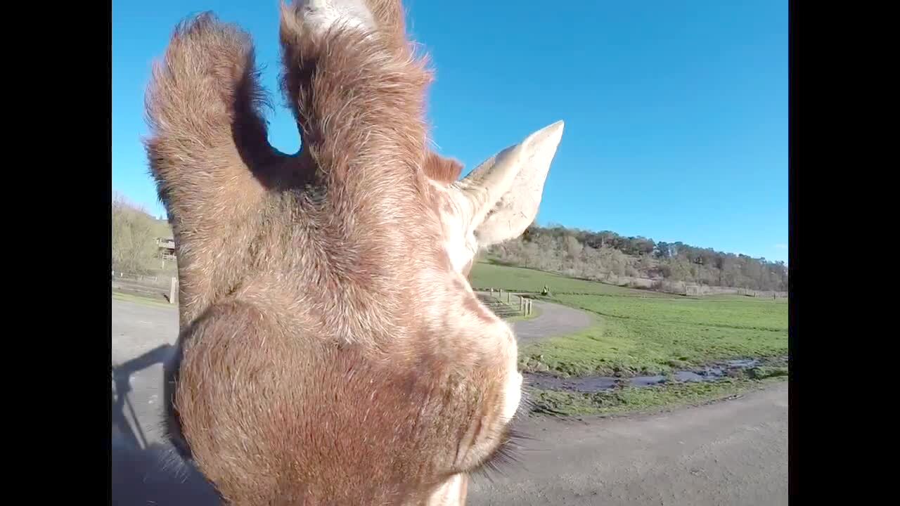 An ox spits into a woman's mouth, then she drinks water so she can gag and spit out of her car at a drive through safari park.