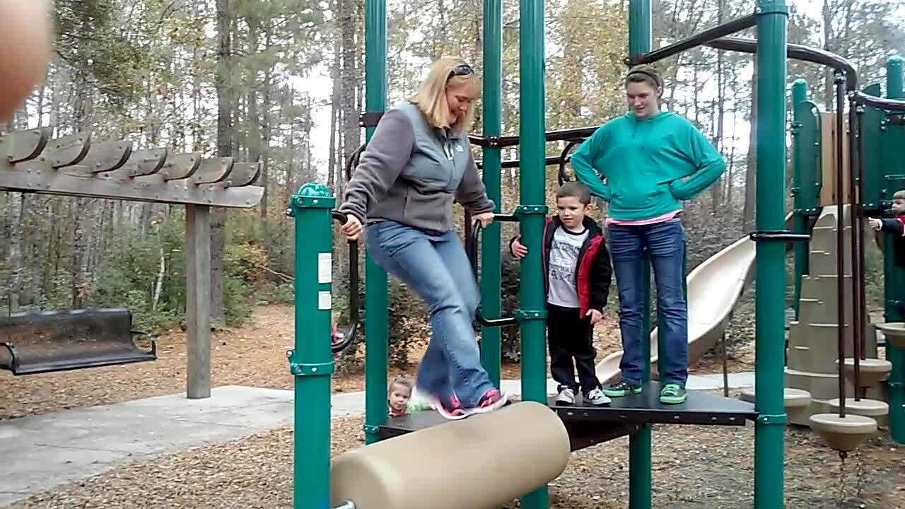 A woman falls when she hangs from a play structure that spins her at a playground park.