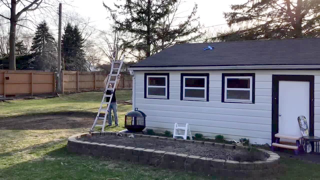 A man uses a ladder to climb onto the roof of a house to grab a young boy's toy plane. The dad tries to throw it to his son but it lands on the roof of a different house.