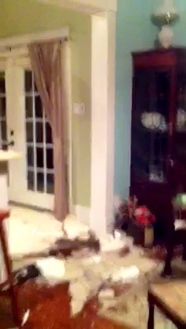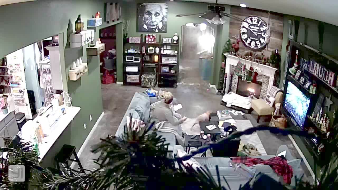Home security camera footage of a woman who sits in the living room and then gets scared when part of the ceiling collapses and her husband's leg falls through.