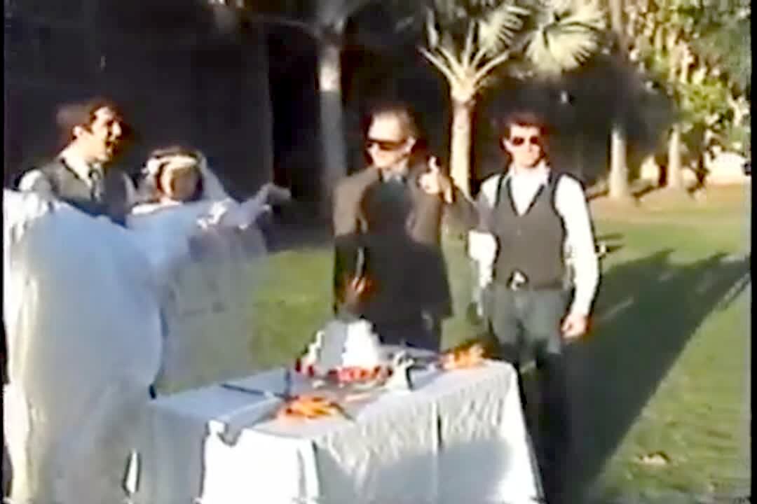 Groom picks up bride and spins around at outdoor reception, falls over and drops her on cake on folding table. Possibly staged.