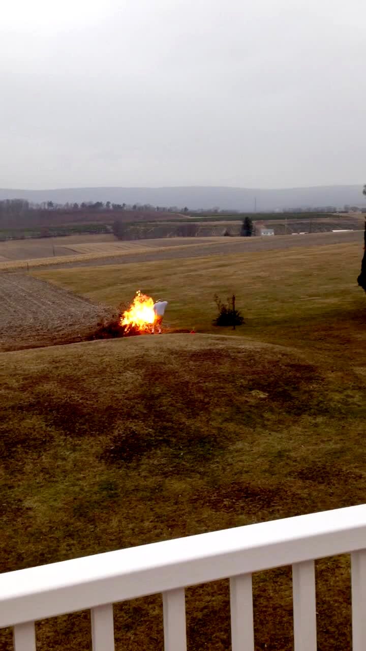 A man pours gasoline on a pile of leaves in his yard and lights it on fire. It bursts into flames and the man is knocked backwards by the explosion.