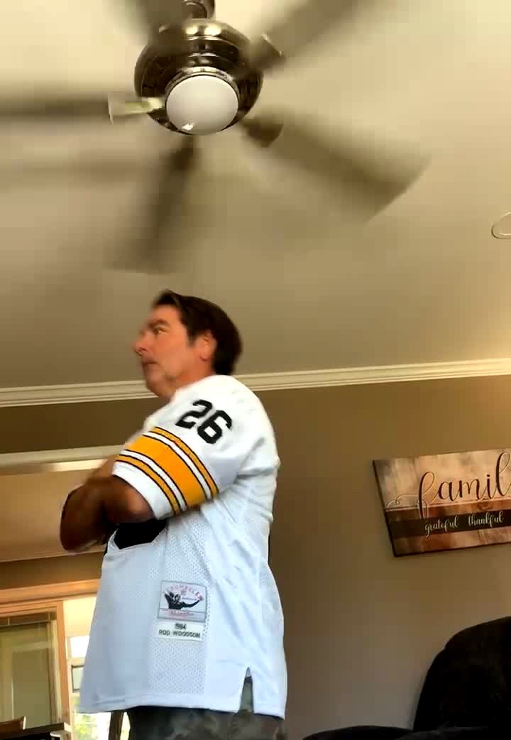 A man stands in the living room and paces around as he watches a football game on television and then the man gets excited and throws his arms ini the air and jumps and hit's his hands in a ceiling fan and then falls to the floor and an off-camera woman laughs