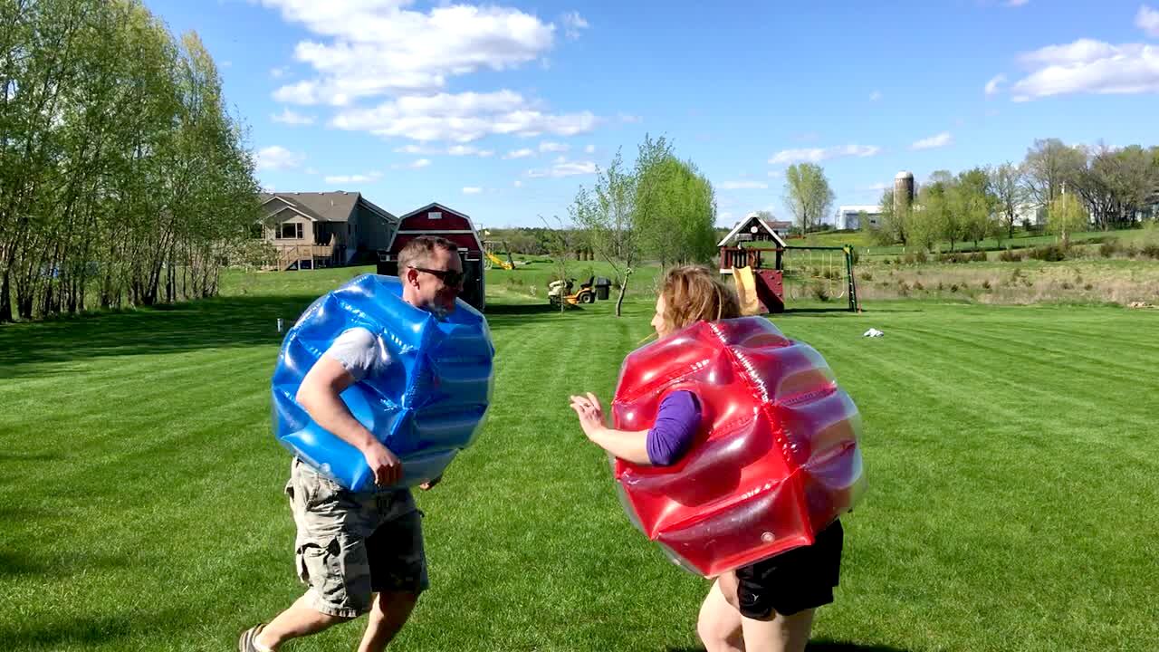 A man and woman wearing child sized inflatable Bubble vests run into each other. The woman gets knocked to the ground.