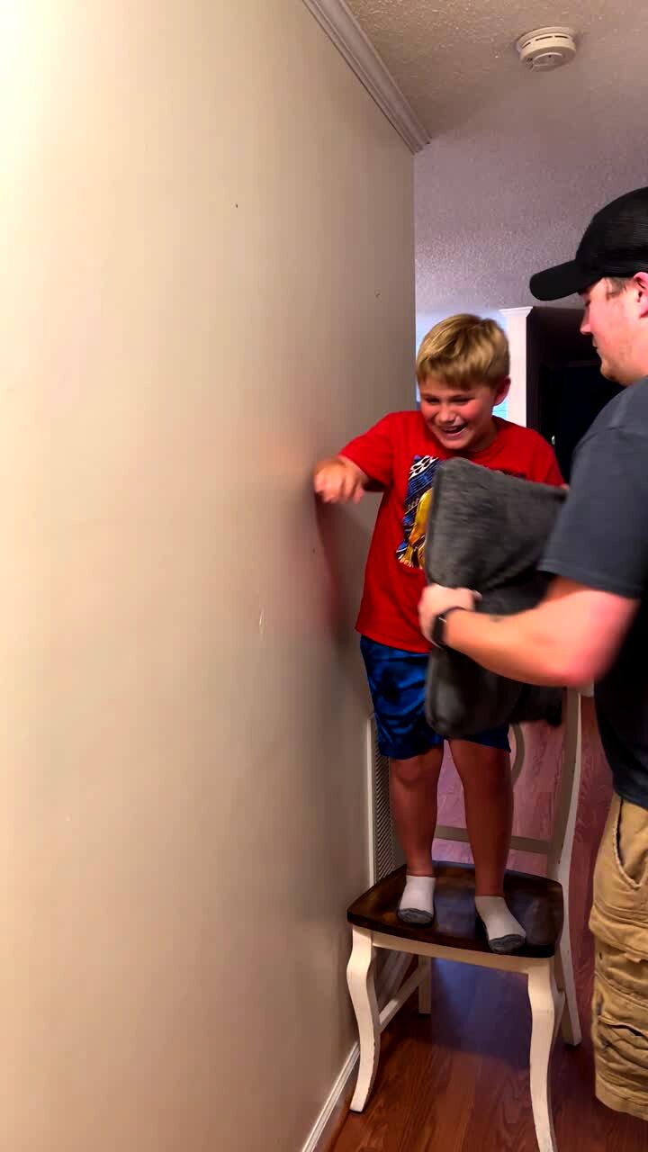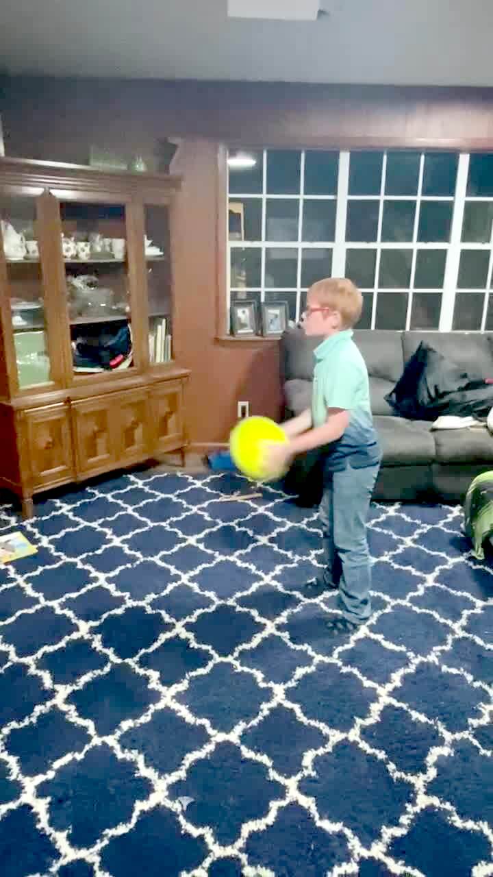 A young boy throws a ball at a living room ceiling, before a panel falls off to the floor.